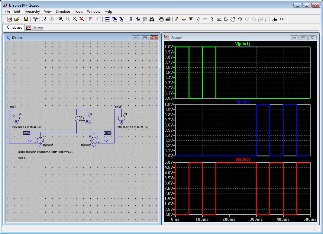 V simulátore LTSpice IV som vytvoril simuláciu toho, čo sa deje pri komunikácii. Dátová linka je pripojená cez pull-up rezistor 4,7k na +5 V. To ju drží stále na napätí 5 V a obe strany komunikácie pripájajú línku na GND, keď potrebujú niečo oznámiť druhej strane.